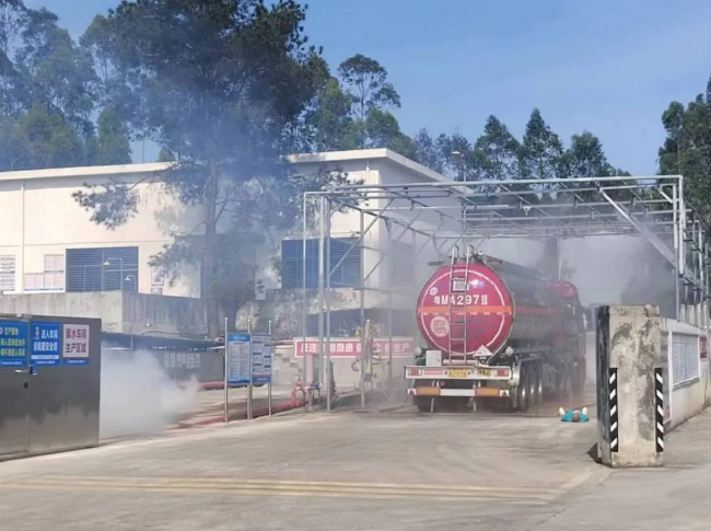 搶險(xiǎn)救災(zāi)組趕往事故現(xiàn)場實(shí)施應(yīng)急救援。一名人員駁接消防水帶,用開花水槍對泄漏氨氣水霧稀釋,以降低氨氣的濃度,另一名人員使用堵漏工作進(jìn)行泄漏點(diǎn)堵漏。