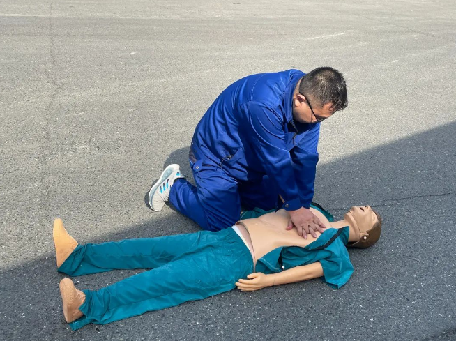 醫(yī)療救護(hù)組穿戴好防護(hù)用品,使用擔(dān)架抬出傷員,并進(jìn)行心肺復(fù)蘇。